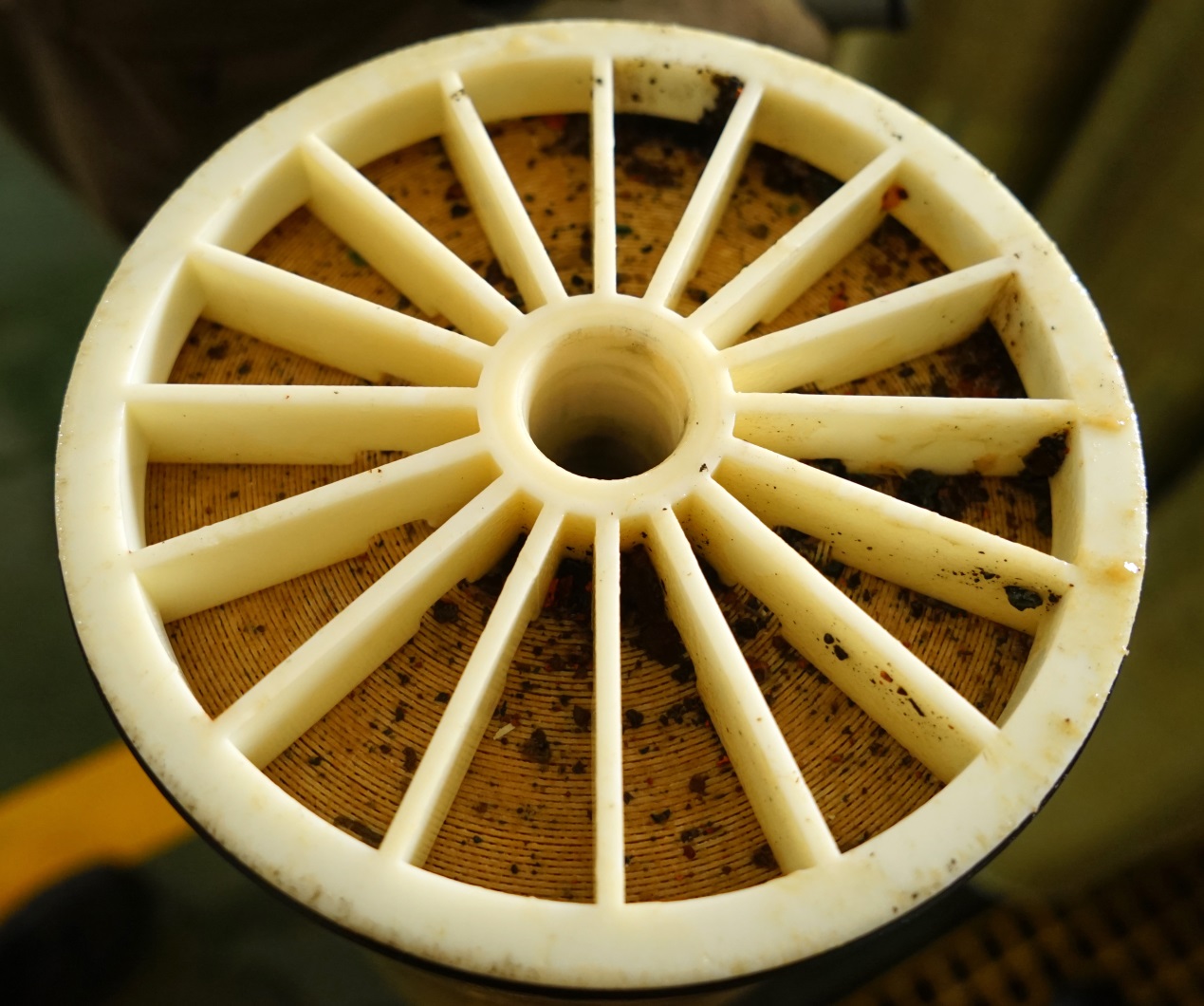 圖一 清洗前反滲透膜端面上的固體顆粒和黃色粘稠物