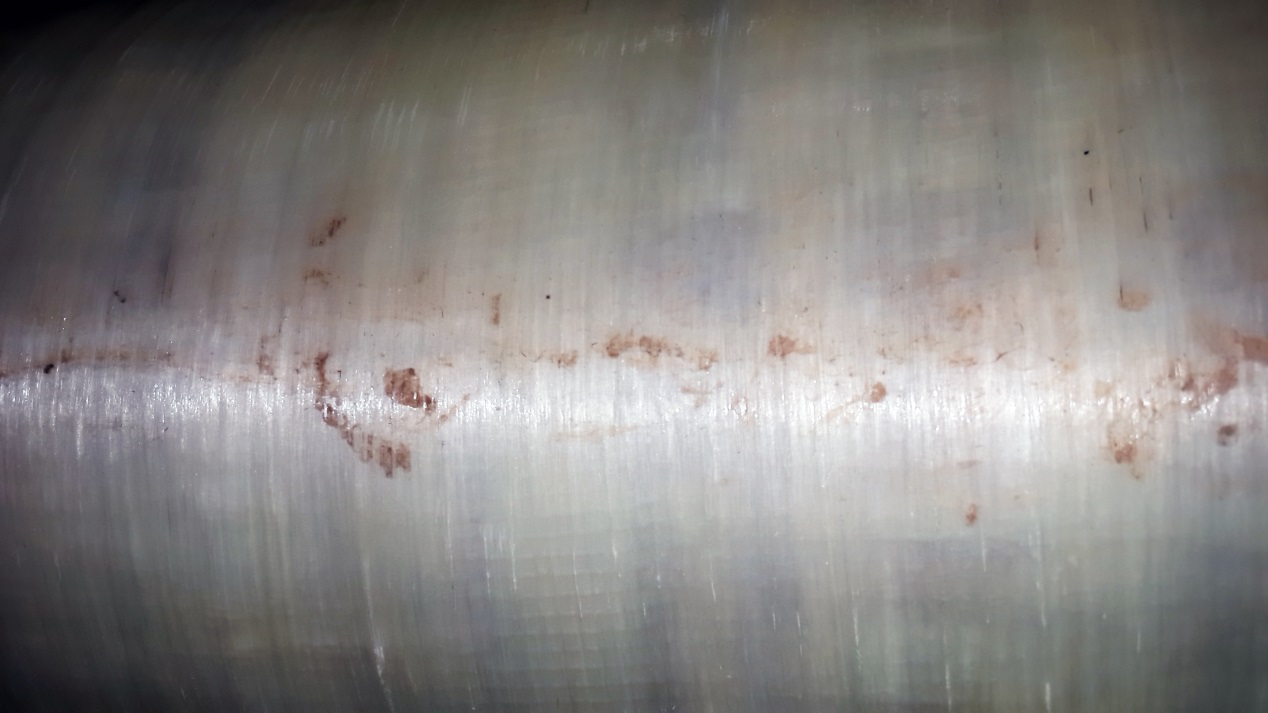 批注:近距離觀察發(fā)現(xiàn)膜的夾層內(nèi)已經(jīng)擠入較多的細砂,鐵屑,等其他固體顆粒懸浮物,這些固體顆粒一部分來自前端細砂過濾器,一部分是反滲透沖洗水和清洗系統(tǒng),這些固體顆粒一旦進入膜內(nèi)將很難清除,特別是細砂。